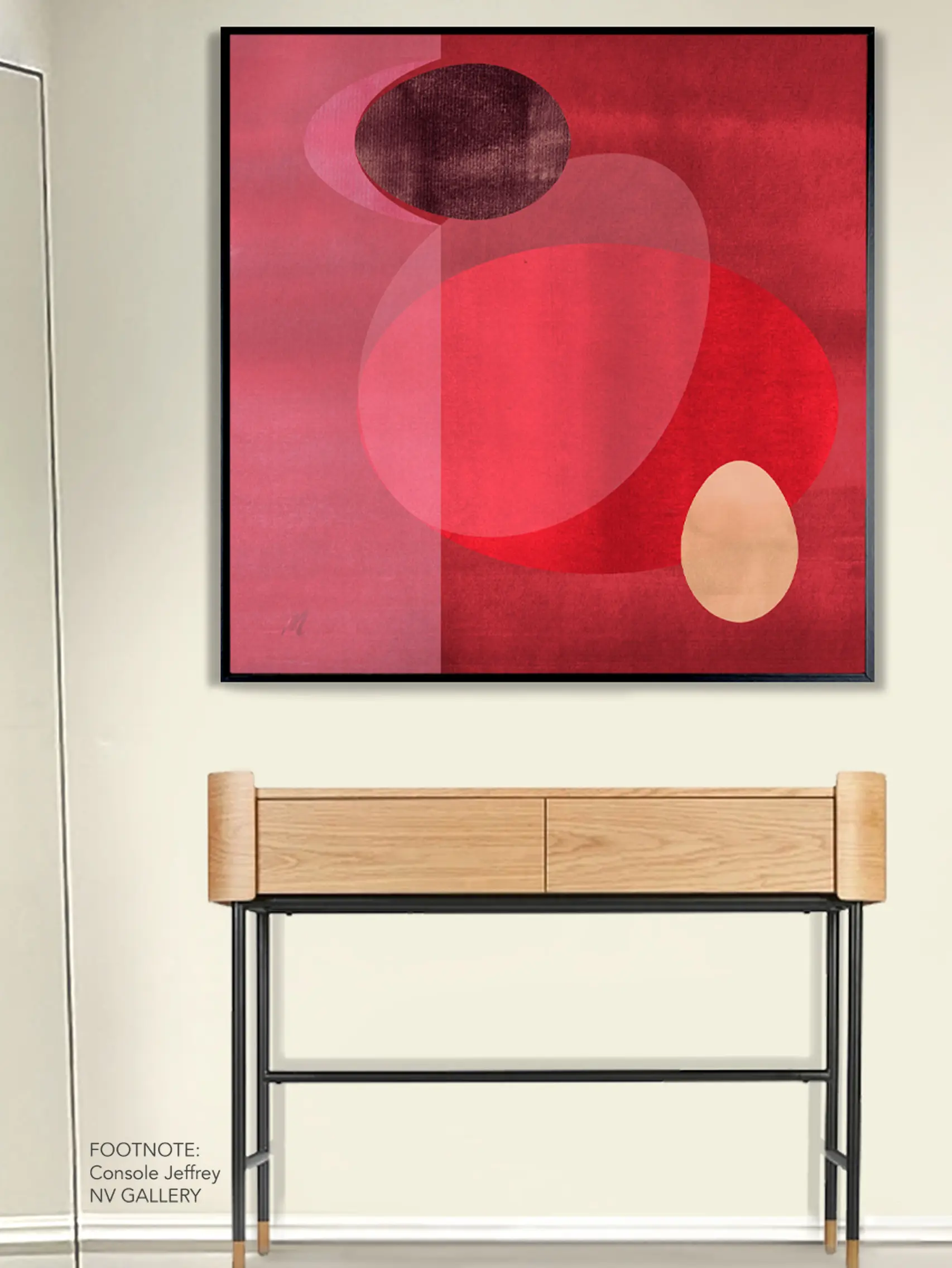 Ovum n8 présente quatre formes ovales sur un fond rouge profond. Ce rouge intense et ces lignes organiques évoquent l’équilibre, la connexion et l’humanité partagée. Ainsi, cette œuvre devient une pièce forte pour tout intérieur moderne et minimaliste.